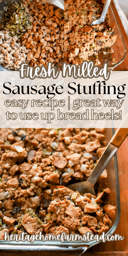 A delicious Fresh Milled Sausage Stuffing recipe made with fresh milled dried bread cubes using our very own Fresh Milled Sourdough Sandwich Bread. This recipe is super easy to make, makes a great side dish, and is sure to please the entire family.