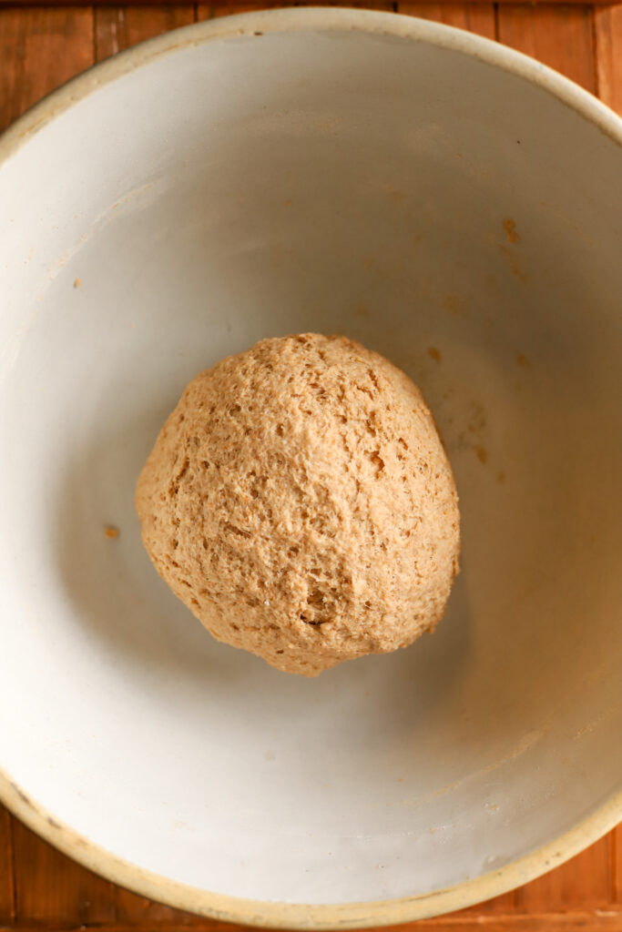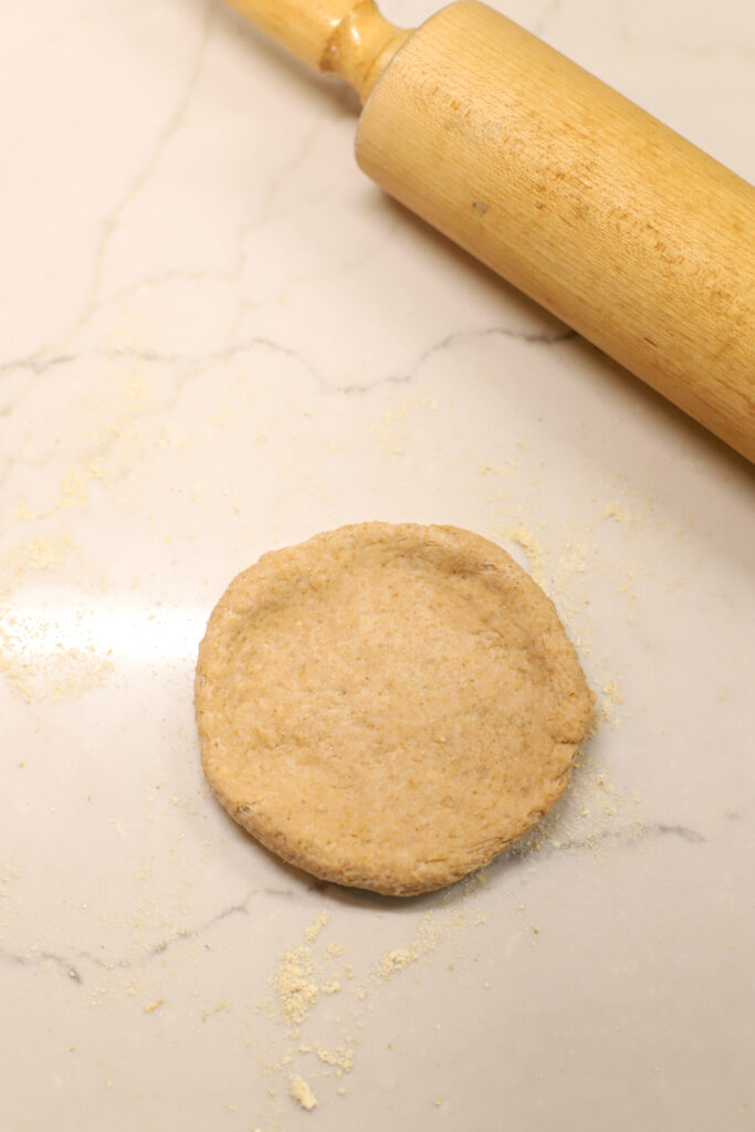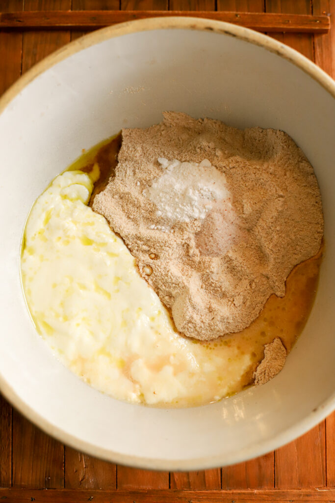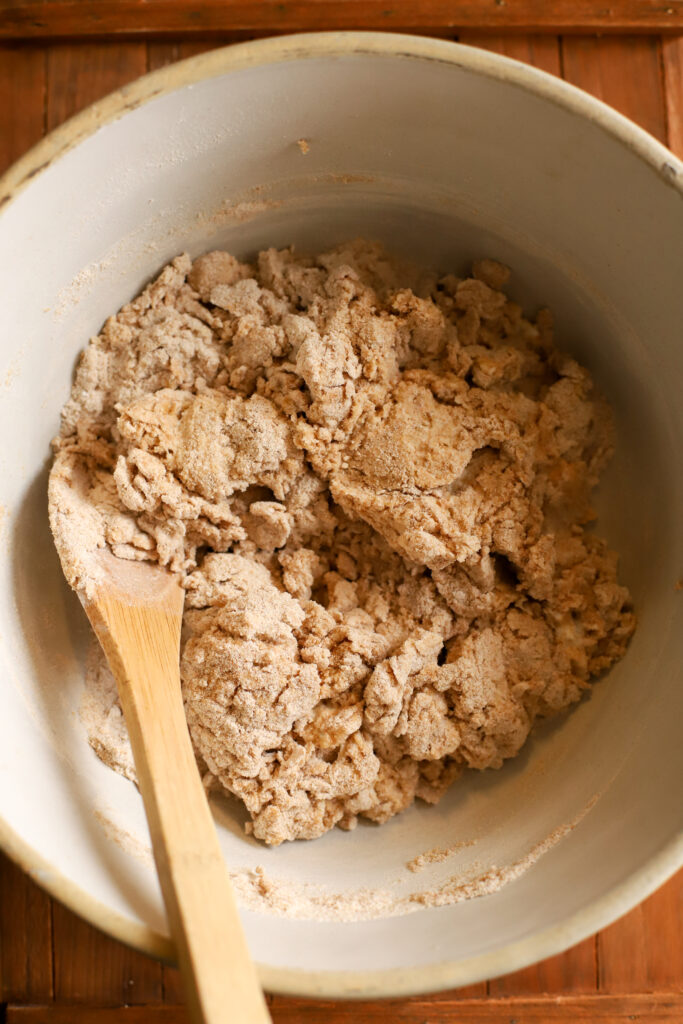 Using a kitchen scale, weigh out 240 grams of hard wheat berries. I prefer weighing my berries before I mill them because it’s easier to measure them and get the perfect amount of milled flour. Mill the wheat berries into flour. In a medium size bowl, mix together flour, 2 teaspoons of baking powder, 1 teaspoon of salt. Then, mix in wet ingredients. Mixture will be shaggy. Knead the dough until combined, this takes about 2 minutes. Cover the dough and allow it to sit and rest for 15 minutes.