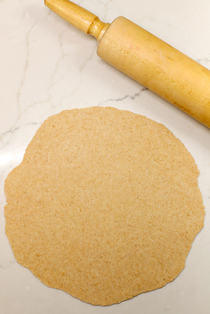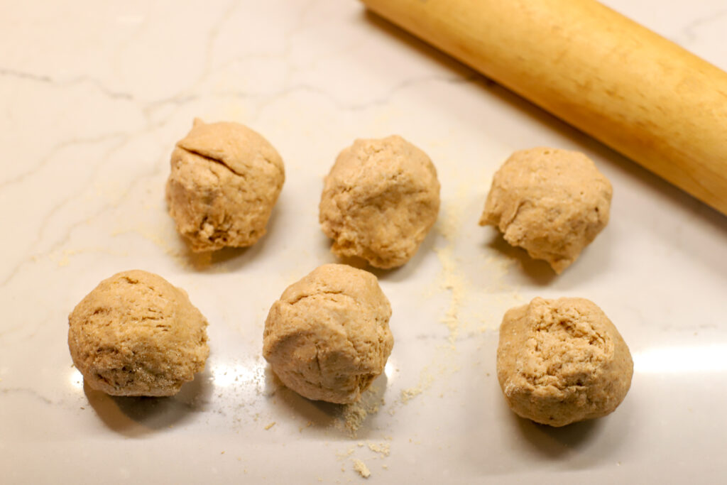 - Divide dough into 6 balls. On a floured surface, roll out tortillas one at a time into a 10" circle. I like to do this by first flattening the dough into a round shape before placing it on the counter and rolling it into a round 10" circle using a rolling pin. Rolling out tortillas can take a a bit of skill but with a little practice, you'll get the hang of it. Take your time. Don't be discouraged if your first one looks a little wonky.